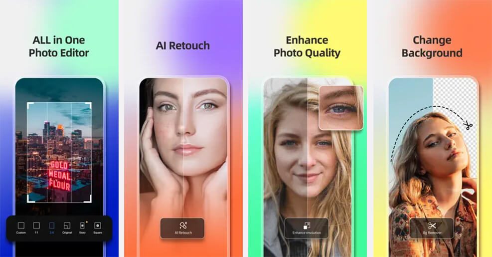 The app has a lot of tools for making your photos look better, especially pictures of people. It also has a bunch of different ways to change how your photos look, like making them look old or just black and white. You can even use AI to make new backgrounds for your pictures that look really cool.