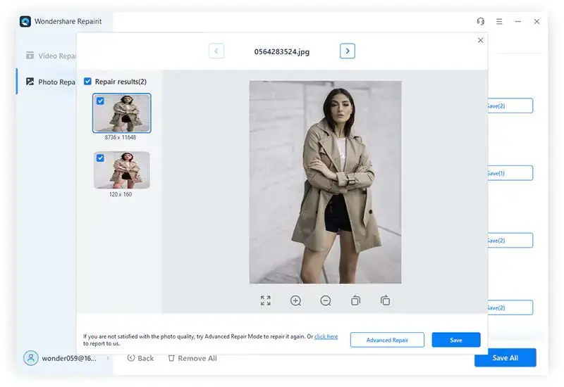 Step 2: Click “Repair” and start the photo repair process. It will fix the sharpness and resolution of your image to make it look better.