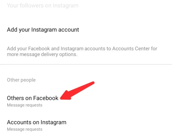 If you want to stop outsiders, who are not in any way connected to you, from sending you messages on Facebook, still under Message Delivery, you must scroll down to the Other People section. There you’ll find two options, “Others on Facebook,” and “Others on Instagram.” Tap on “Others on Facebook.”